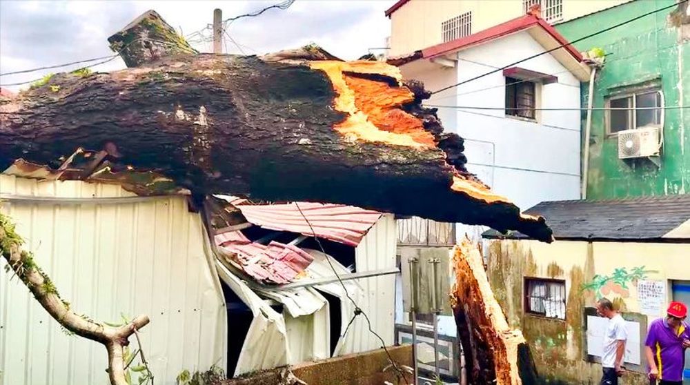 圖:水里鄉玉峰村一棵300多年老芒果樹攔腰折斷,壓毀3間鐵皮倉庫。