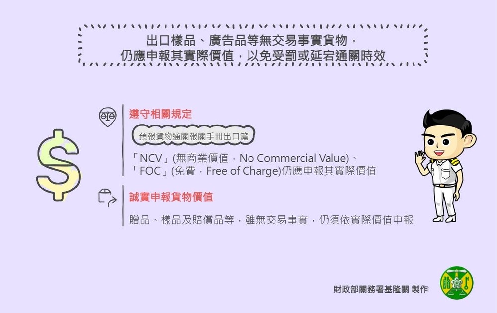 基隆關說明,依「出口貨物報關驗放辦法」第10條第1項規定,出口貨物價格應以輸出許可證所載之離岸價格為準;如無輸出許可證,則須以輸出口岸之實際價值據實申報。依據「預報貨物通關報關手冊(出口篇)」相關規定,申報「禮物、贈品、樣品、調換、賠償、廣告品」時,即使發票上載明「NCV」(No Commercial Value,無商業價值),仍須如實申報實際價格,不得僅以「NCV」、「FOC」(Free of Charge,免費)或「0」應付了事。