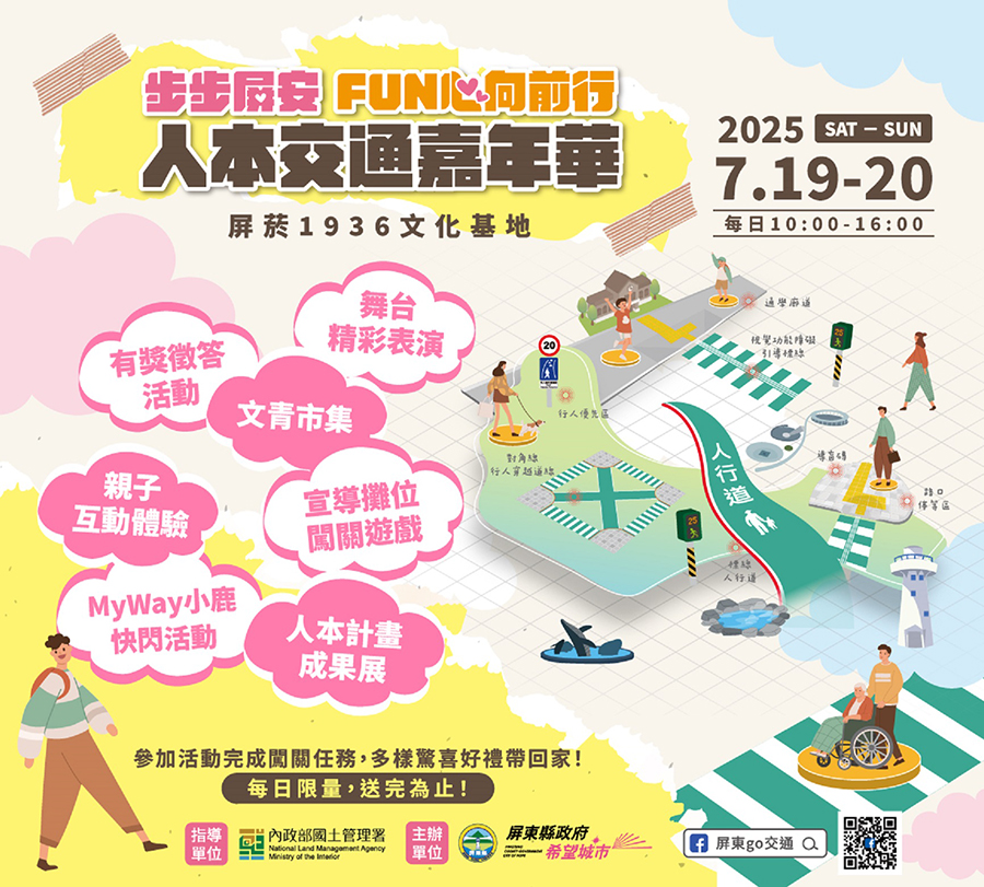 本次嘉年華活動規劃一系列兼具教育性與趣味性的活動,包含精采舞台演出、有獎徵答、親子互動闖關、內政部國土管理署MyWay小鹿快閃活動以及充滿生活風格的文創市集,讓不同年齡層民眾皆能在輕鬆氛圍中,認識人本交通的核心精神,現場也將展示屏東縣近年推動人本交通環境改善的成果,邀請民眾一同見證宜行城市的進步軌跡。