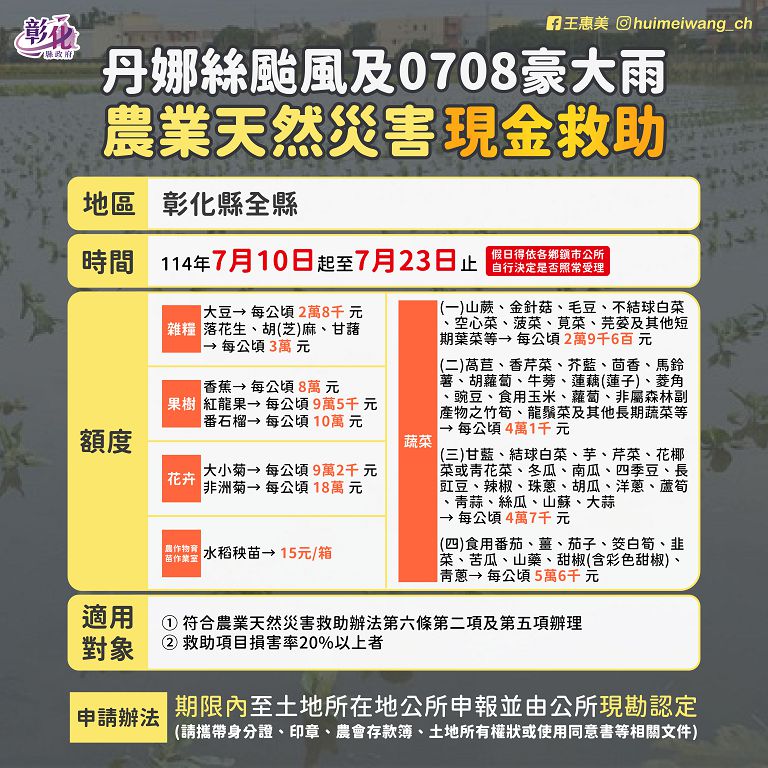 【記者鄭惠珠彰化報導】經農業部公告彰化縣因「114年丹娜絲颱風及0708豪雨」致農產業受損已符合農業天然災害現金救助標準,公告品項包含「大豆、落花生、胡(芝)麻、甘藷、香蕉、紅龍 果、番石榴、大小菊、非洲菊、「農業天然災害現金救助項目及額度」所定蔬菜類、農作物育苗作業室-水稻秧苗」,現金救助額度以「農業天然災害現金救助項目及額度」所定救助額度為標準,其申請救助項目損失率達20%以上者,即可向土地所在地公所提出申請現金救助,未達20%者不予救助。