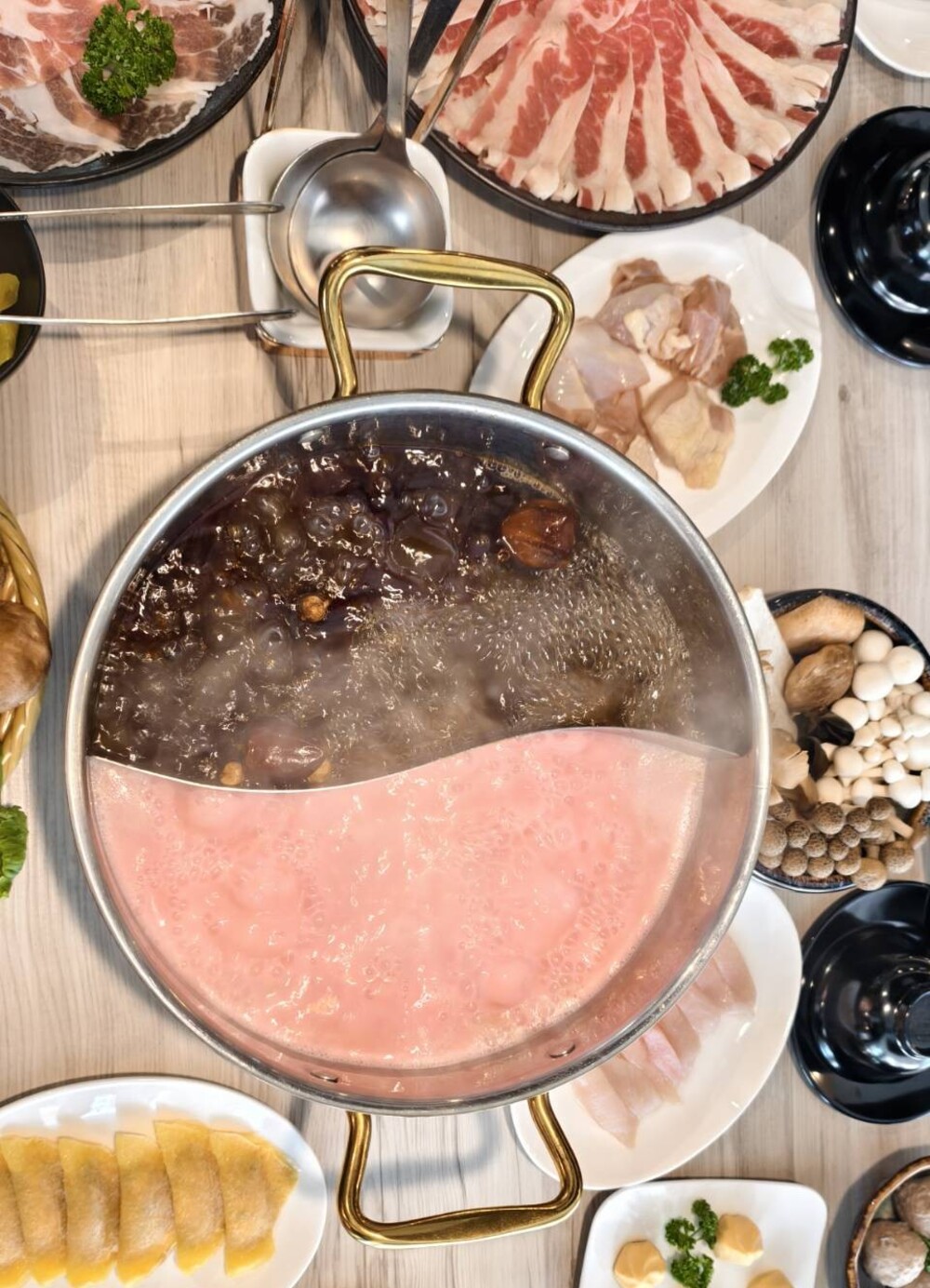 還有夢幻新風味「奶香甜菜牛骨湯」為基底的粉紅鍋,創新口感更是一絕,搭配豪華優質肉品、蔬菜、丸餃拼盤等精緻套餐,滿足視覺與味覺的雙重享受,每日限量10組,需提前三天預訂。
