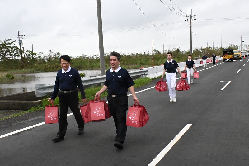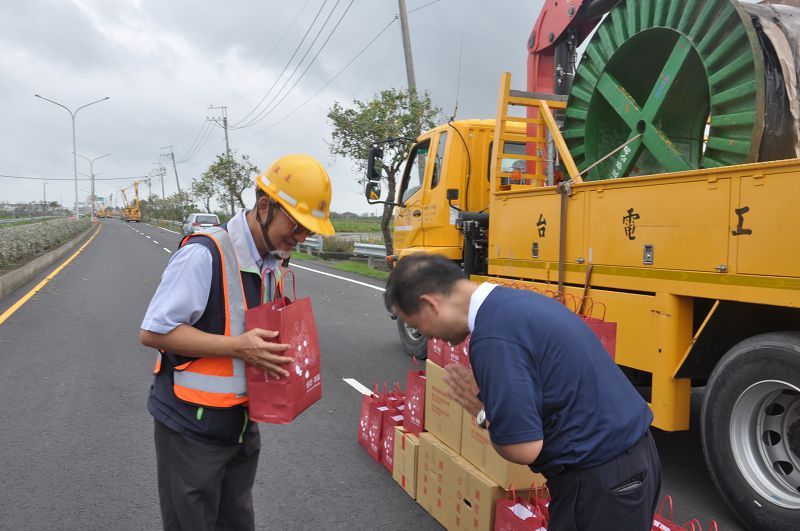 慈濟志工合十彎腰、深深感恩,手把手將祝福及致敬的心意親送。志工蘇錦春自己家的工廠在這次風災也受損,連日來也是不斷清掃勞動,深刻體會跑在前線台電人員修復的辛苦,這次特地來感謝台電人員。蘇錦春說:天災不可抗,證嚴上人常提醒我們「敬天畏地」,要用最虔誠的心,來祝福全天下的每一個人。
