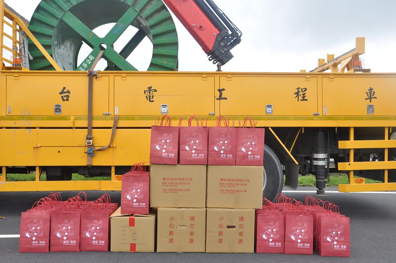 來到現場送暖的慈濟志工準備了120份的結緣品,包含一早剛出爐的葡吉麵包,及多樣的即食營養產品,有米果、凍飲、穀力棒等食品,讓台電人員方便攜帶,隨時可以補充營養、保持體力。