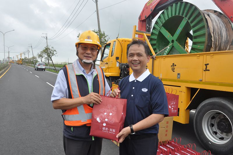 丹娜絲颱風帶來驚人強陣風與豪雨,災後第四天,台南沿海地區災損嚴重,部分社區電線桿還是橫倒在路上,電力不通。各縣市台電工班集結災區,不分烈日驟雨,通宵達旦緊急搶修。7月9日上午台電台南區營業處處長黃明舜來到將軍區台17線溪亁寮關懷辛苦的工班,慈濟志工也到場慰問,並致贈營養品結緣,慰問勞苦功高的第一線搶修英雄。
