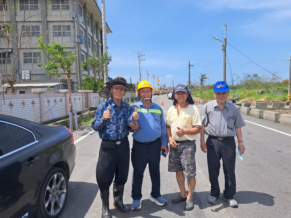 昨天早上該路段已全面封閉,台電委託昇傳工程公司進駐搶修電力設施,是由高雄、屏東前來新營、鹽水,前天在麻學路支援,昨天進入學甲竹篙山南一線道路支援搶修,陳桂記大宗祠高雄宗親會理事長也是工程帶班,學甲陳桂記大宗祠董事長陳裕榮等人專程送飲料、冰塊等探班慰問。