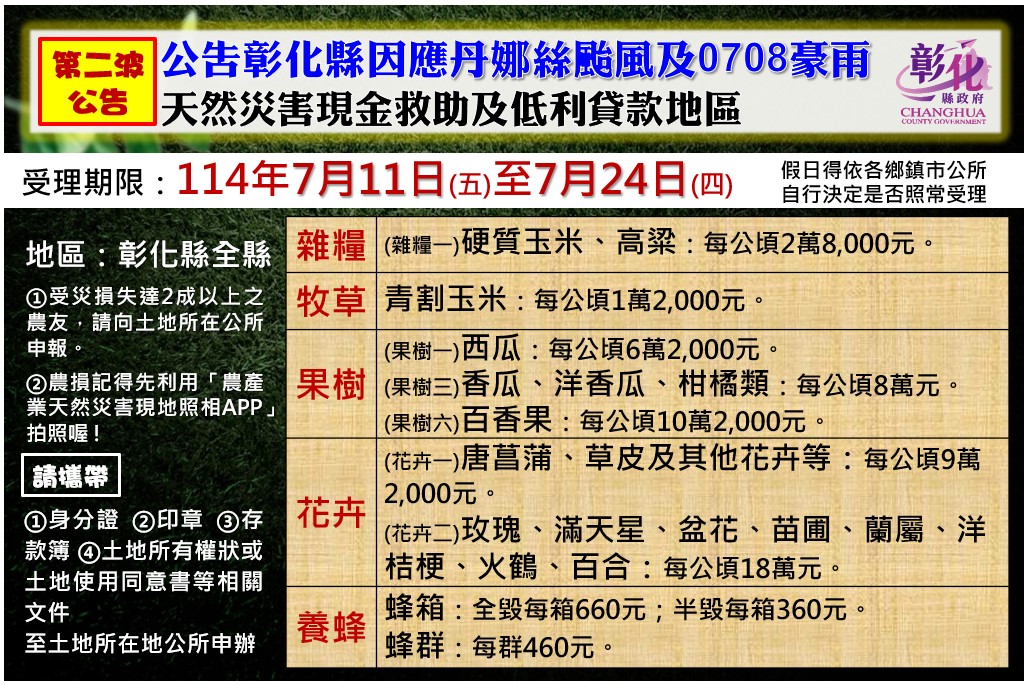 【記者鄭惠珠彰化報導】經農業部公告彰化縣因「114年丹娜絲颱風及0708豪雨」致農產業受損已符合農業天然災害現金救助標準,農業部公告第二批次品項包含「硬質玉米、高粱、青割玉米、西瓜、香瓜、洋香瓜、柑橘類、百香果、花卉(大小菊、非洲菊除外)、養蜂」,現金救助額度以「農業天然災害現金救助項目及額度」所定救助額度為標準,其申請救助項目損失率達20%以上者,即可向土地所在地公所提出申請現金救助,未達20%者不予救助。