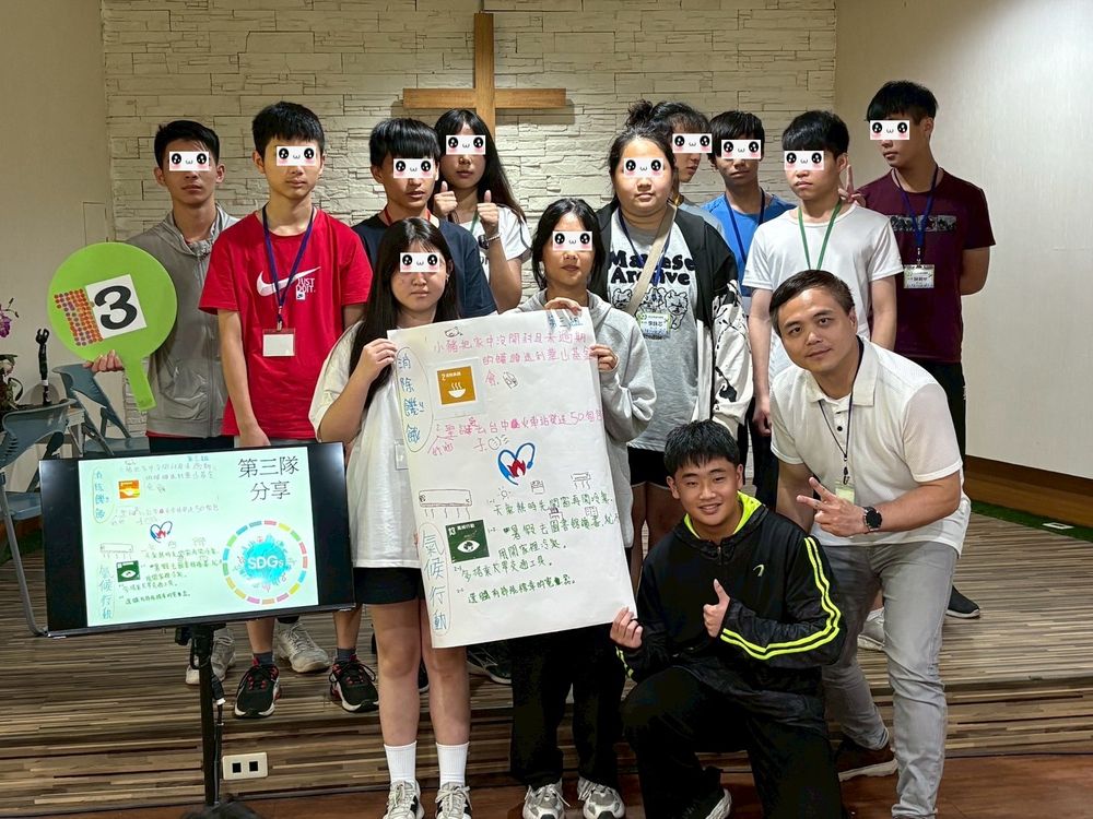 翌日早晨,學生們進入「永續夢想家」單元,透過遊戲與小隊討論認識聯合國永續發展目標(SDGs)17項內容。每隊抽取一至兩個永續主題,如氣候行動、減少不平等、潔淨水與衛生等,從自身經驗出發,討論生活中已實踐的行動,並進一步提出未來可推動的方案與目標,學生們製作出充滿想法與創意的海報,並在舞台上自信分享他們的構想,透過互動遊戲與分享,學生們不只認識世界議題,更將方案轉化為具體行動提案,展現責任感與創造力。