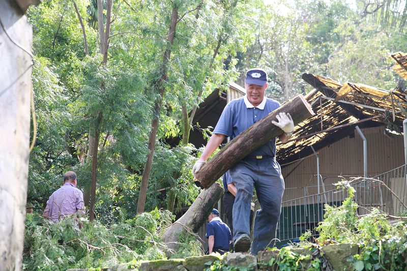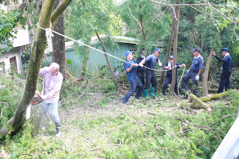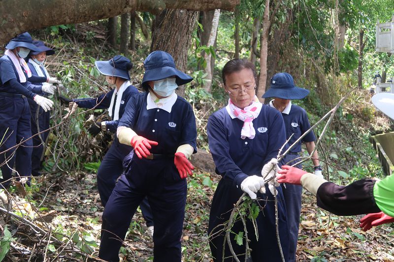 颱風肆虐後,環抱之樹傾斜,後山細枝殘葉散落各處,志工分工,男眾處理大樹,桃花心木、杉樹,必須保留下來;女眾清理後山邊坡,山上的樹枝不往下移,因為下過雨泥土會流失,所以上方的樹枝往樹的後端疊,形成保護的屏障;下方的樹枝,清到後面觀音殿的中庭,或是移到廣場前,只要方便清運車清運即可。