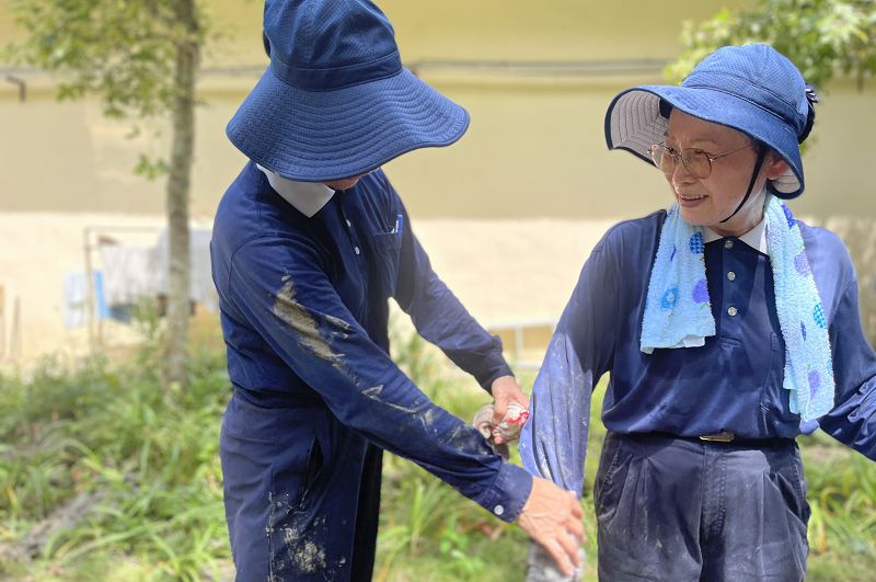 後山邊坡濕滑,女眾志工跟著自諗法師:「我做一次,你們跟著做就是種子,後來的人你們要傳承教他們。」上面水溝裡的樹葉,掃起來或是用手撈起,先放在袋子裡,再拿到高一點的地方倒;下面水溝有汙泥,「來,我做一遍給你們看。」自諗法師先準備好多桶子、鏟子,雙腳跨進水溝:「將土鏟進桶子裡,上面的人把土倒進花園。」法師交代不要裝太多,太重倒土的人會很累。
