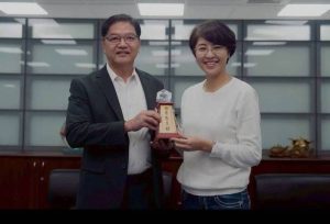 第四組巡官楊定秋於7月9日陞任彰化縣警察局秘書科警務員,副分局長劉晃聞為感謝特頒贈分局紀念品。(田中/羅廷媚)