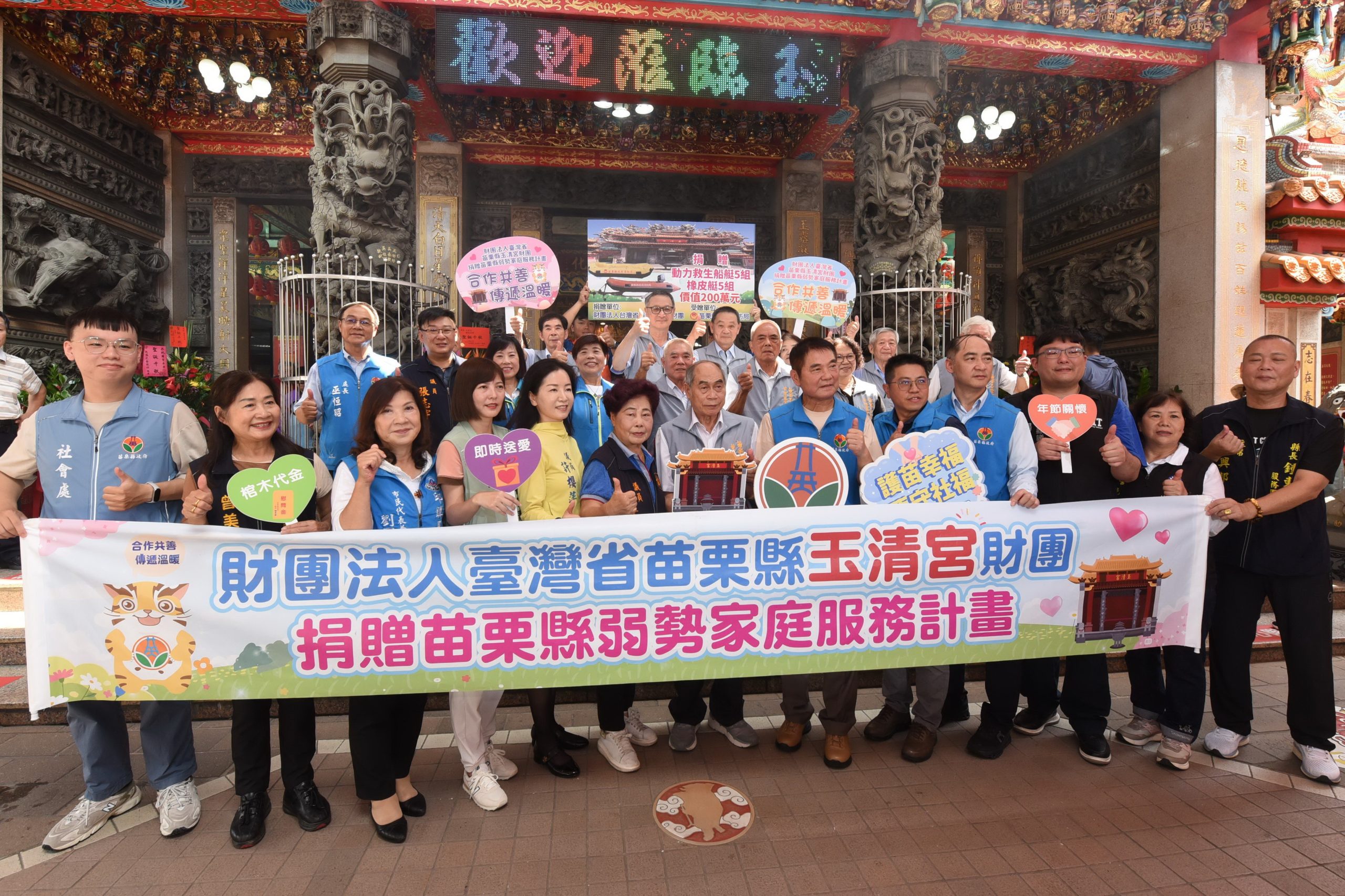 財團法人臺灣省苗栗縣玉清宮財團持續多年挹注救護車、物資和善款做公益,累計逾二千萬元,十八日再慷慨解囊捐贈縣府五百萬元;其中三百萬用於弱勢家庭服務計畫強化社會安全網,持續擴充急難救助量能並提供更完善的社會福利服務,另二百萬則為消防局添購救人救災的橡皮艇,提升救災效能與安全性。