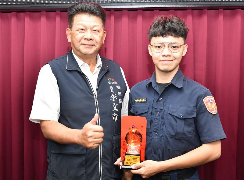 中市警五分局北屯派出所警員施呈諭協助搶救心肌梗塞男子救回一命,其忠勤精神展露無遺,使他膺選「好人好事楷模」;警察局長李文章在局務會報公開表揚施員,致贈警察公仔水晶獎座及千元禮券以資鼓勵。林男家屬抵達醫院得知,林男與死神拔河時有員警及護理師合力搶救,其家屬對警方助人義行萬分感謝。經督察組警務員吳育慧查證屬實,施員搶救昏厥男子,適時伸出援手救回寶貴生命,充分發揮為民服務精神,對提升警察正面形像大有助益,足為同仁表率、殊值嘉許。局長李文章頒發獎座及千元禮券給警員施呈諭。(圖文:台中記者許順德)