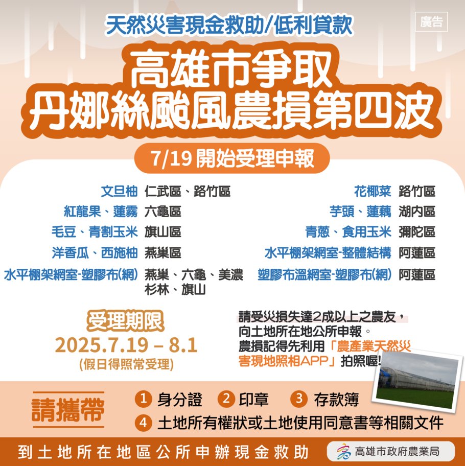 高雄地區受丹娜絲颱風影響,累積農損超過1億1846.3萬元,第一波西瓜、香瓜、短期葉菜類、第二波香蕉、苦瓜、胡瓜,以及第三波芭樂、木瓜、改良種芒果、龍鬚菜等作物現金救助目前刻正受理中;此外,市府再成功爭取第四波救助,包含10個行政區共15項救助,經農業部公告自19日起至8月1日止受理農民申報,農業局將持續查報,全力爭取救助。農業局長姚志旺表示,農業局會持續依市長指示積極爭取救助,凡作物及設施受損達2成以上之農友,可先利用「農產業天然災害現地照相APP」拍照,務必於8月1日前持身分證、印章、農會存款簿及土地所有權狀或土地使用同意書等相關文件,向區公所申辦現金救助,農友復耕若需低利貸款,亦可洽農會辦理。(圖文:記者于欽智)