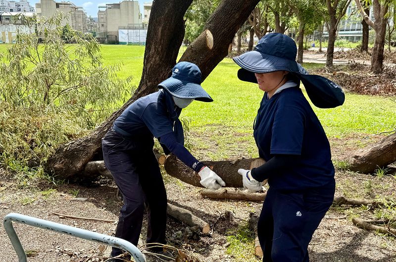 天氣炎熱,有人早已汗如雨下,滿臉通紅。志工默契十足,鋸下的樹枝立即搬走,或接力,一區接著一區將散落雜亂的樹枝集中。