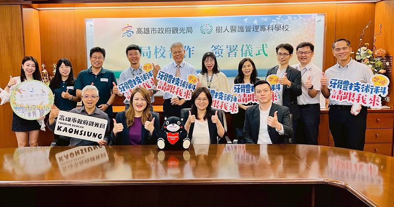 高雄市政府觀光局為結合醫護拓展觀光產業,高閔琳局長特前往樹人醫護管理專科學校拜訪,並與校長林品瑄簽署合作備忘錄,開啟觀光與醫護專業跨域整合的新篇章,這也是高雄首度由觀光局攜手醫護類學校,共同推展動物福祉與教育應用,極具指標性意義。高閔琳局長期盼未來攜手牙體技術科及口腔衛生科,辦理動物義齒及口腔保健工作坊,亦歡迎應用英語科及應用日語科學生於高雄冬日遊樂園、燈會等大型活動,擔任志工協助接待外籍旅客與貴賓,更期盼樹人醫專師生到壽山動物園參訪交流,一起為提升園區動物福祉而努力。(圖文:記者于欽智)