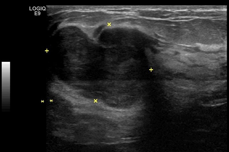 術前超音波影像可見,有一約3公分大腫瘤(四個黃色十字標記處)。