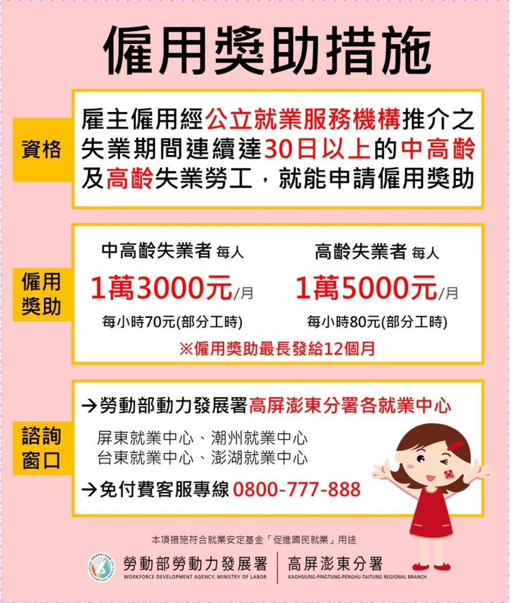 勞動部高屏澎東分署為協助中高齡勞工重返職場,運用「僱用獎助」計畫連結在地企業與人才,使其順利轉職,在人生下半場安穩就業,並解決產業缺工的人力需求。高分署長郭耿華指出,因應高齡化社會趨勢,勞動部積極透過「僱用獎助」協助中高齡勞工穩定就業,並鼓勵企業僱用中高齡勞動力,凡符合就業保險投保單位資格的雇主,採按月計酬方式僱用45歲以上中高齡或高齡者,每個月就可領取1萬3千元至1萬5千元不等的僱用獎助,最長可領12個月,詳情可洽高分署所轄各地就業中心或撥打免費客服專線0800-777888詢問,或上台灣就業通網站(www.taiwanjobs.gov.tw)查詢。(圖文:記者于欽智)