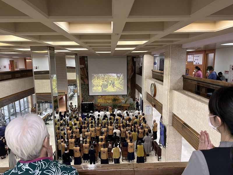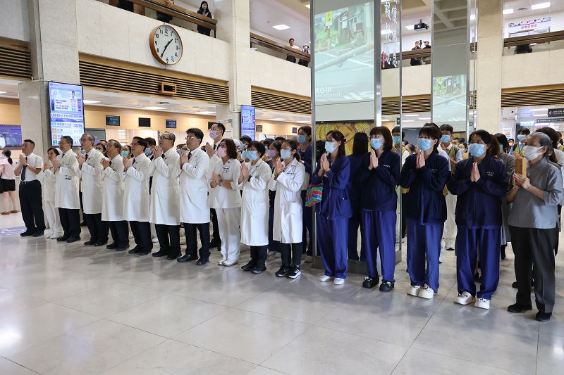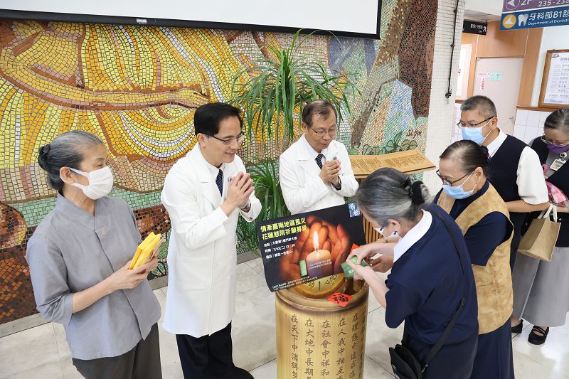 7月22日下午一點二十分,由花蓮慈院院長室和人文室發起的「情牽嘉南地區風災 花蓮慈院祈願募愛」活動,由花蓮慈院林欣榮院長帶領,許文林副院長、吳彬安副院長、何宗融副院長、陳星助副院長、李啟誠副院長、張宇勳副院長、王棋顧問,護理部鍾惠君主任、志工室顏靜曦主任,帶領全院同仁至大廳中庭聆聽上人開示。上人感恩慈濟志工在風災後第一時間即出動清理環境、幫助災民,同時叮嚀慈濟人要關心而非可憐他人,要真誠與他人互動。而佛陀來人間的一大事,即是覺有情,啟發眾生原有的如來智性,轉迷為覺。