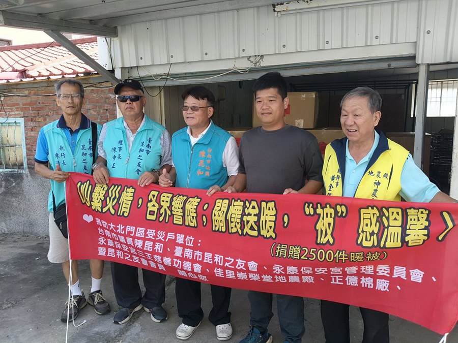 【記者黃永豐台南報導】台南市議員陳昆和聯合昆和之友會、永康保安宮管理委員會、永康保安宮三王慈善功德會、佳里崇榮堂地農殿、正億棉廠及眾多昆和之友會會員及善心人士共同發起「送溫馨四季涼被」行動,傳遞溫暖給災區鄉親,備受各界好評。