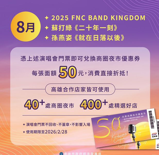 盛夏八月,高雄大咖演唱會熱潮登場,將在連續3週末高雄巨蛋迎來超強陣容開唱,首週末2、3日由韓國FNC娛樂旗下FTISLAND、CNBLUE、等5組跨世代樂團的《2025 FNC BAND KINGDOM IN KAOHSIUNG》登台,第二個週末9、10日金曲天團蘇打綠《二十年一刻》巡迴演唱會最終站就在高雄,而華語天后孫燕姿《就在日落以後》巡迴,將於16、17日首登高雄巨蛋,睽違11年的等待創造秒殺紀錄;高雄市政府於8月份配合演唱會活動續推面額50元商圈夜市優惠券,樂迷只要憑上述3場演唱會票根即可至指定捷運站兌換,還能直接用於40+處商圈夜市與400+家合作店家消費折抵,詳情請關注經發局FB粉絲團、IG及商圈夜市優惠券官網(www.khafterparty.tw),時時掌握商圈夜市優惠券兌換地點與時間,以及各合作店家的相關優惠。(圖文:記者于欽智)