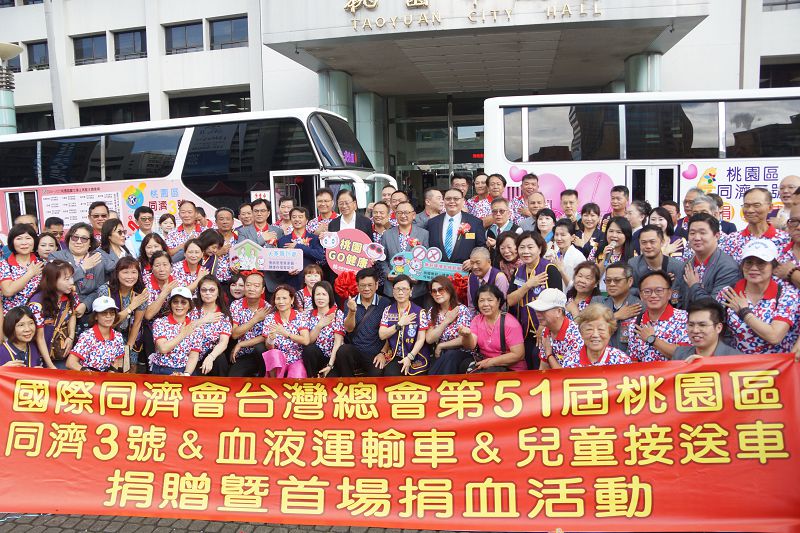 【記者徐玉英桃園報導】桃園市長張善政日前在市府衛生局長賈蔚、教育局主任秘書蔡聖賢、桃園區長許敏松、國際同濟會台灣總會第51屆桃園區區主席鄭文華、總會長甄啟剛、第47屆桃園區區主席胡家智、新竹捐血中心主任王雲龍及中華麥子園愛慈協會觀音分會張正雄牧師等人陪同下,於桃園市政府前廣場出席「國際同濟會台灣總會第51屆桃園區同濟三號及血液運輸車捐贈暨首場捐血活動」。