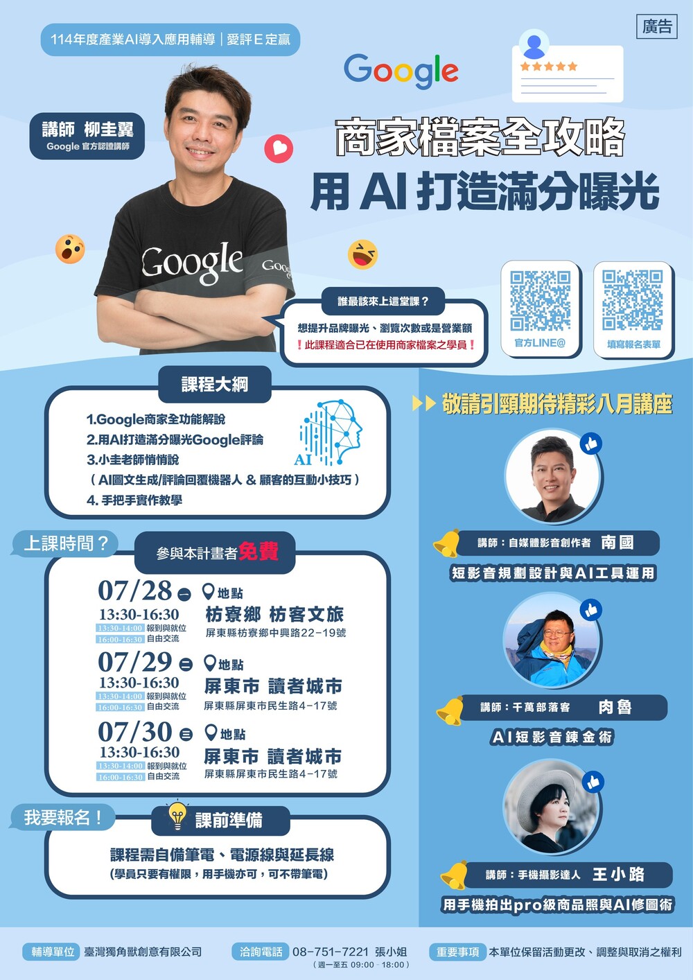 【記者范家豪屏東報導】AI時代來臨,如何善用AI工具強化企業競爭力,是許多中小企業最迫切的課題。為協助屏東在地中小企業掌握最新AI實戰技巧,臺灣獨角獸創意有限公司承辦「114年產業AI導入應用輔導計畫—愛評E定贏」課程,即將於7月底在屏東市與枋寮鄉熱烈展開。