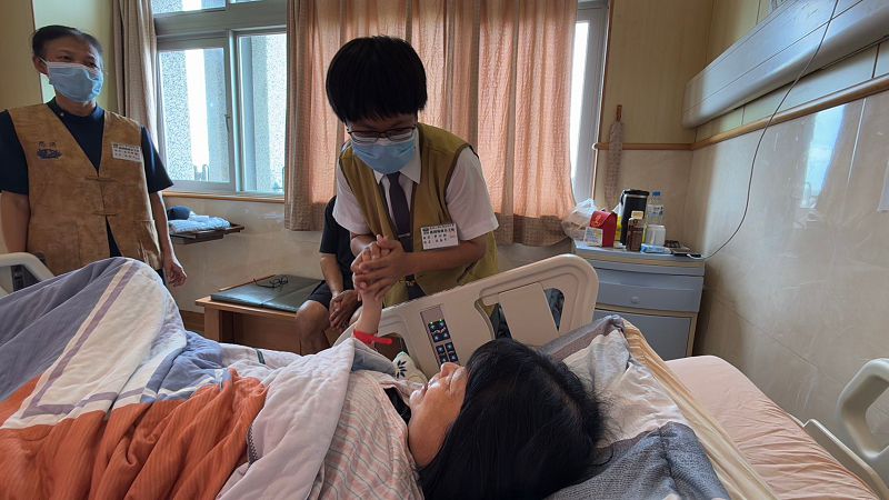 在師姑師伯的陪伴引導下,學員分別進入病房、急診與檢體運送區域,學習送餐、探視、傾聽與祝福。他們也貼上了慈濟志工最溫暖的標誌——笑容。