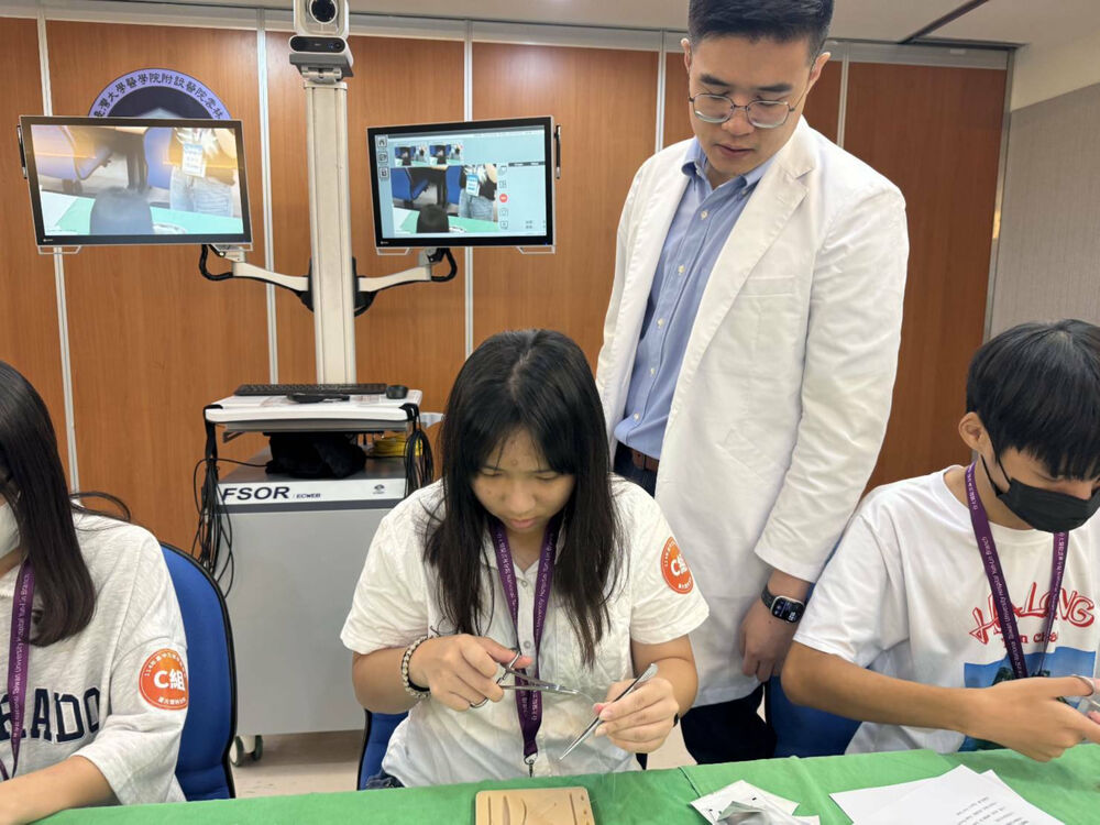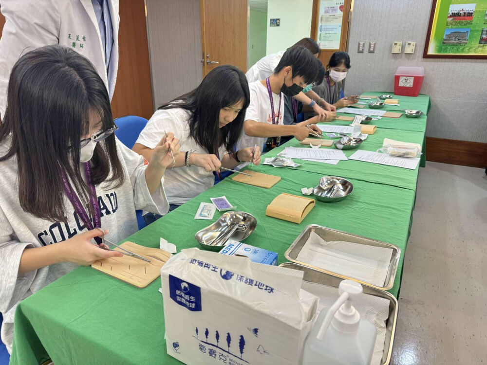 由院長講座揭開序幕,馬惠明院長分享:「很高興看到這麼多年輕學子願意在暑假期間走進醫院、貼近臨床。我們希望透過實作課程,不僅讓大家體驗醫學的專業與深度,也能體會醫師這份職業背後的責任與使命。」他也特別勉勵學生「希望你們未來在學成之後,能把所學帶回家鄉,成為在地的健康守護者。 醫學體驗課程中,學生親手操作外科縫合,並使用傷口模型進行模擬手術訓練;接著操作LAPSIM腹腔鏡模擬系統與Endo Mentor Suite,體驗微創手術與智慧醫療技術的應用。午後課程「關鍵四分鐘:急救英雄」則由教學護理團隊帶領進行BLS基本救命術、護木與三角巾包紮,強化臨床第一線的應變能力。