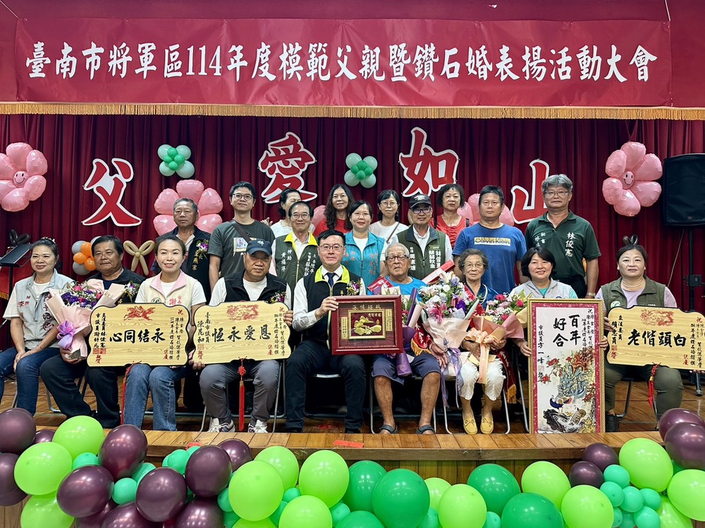 【記者黃永豐台南報導】88父親節快要到了!將軍區公所昨天舉辦114年模範父親暨鑽石婚表揚活動,苓保社區運動班的婆婆媽媽土風舞等表演後,由將軍區長許博森代表市長黃偉哲頒獎表揚11位模範父親及2對鑽石婚伉儷,肯定他們對家庭與社會的付出與貢獻,並提前獻上父親節祝福。