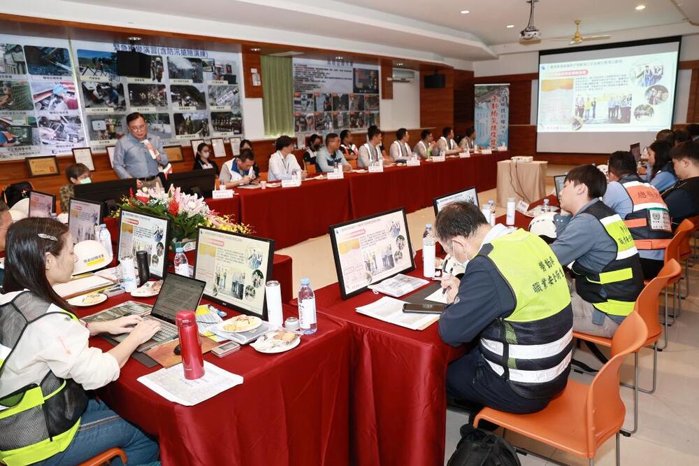今年勞動部優良工程金安?評選,本縣推薦平靜橋災後復建工程團隊參加,王副縣長一早就陪同評審委員們前往平靜橋工程現場做實地評核,並於清境民宿會議室進行工程簡報、書面審查及綜合檢討;分別由督導單位縣府工務處長張宏岳、設計監造廠商聚大工程顧問公司總經理謝宗翰及施工廠商總福營造公司總經理簡逢佑等人分別進行此工程安全衛生與職業安全等管理措施簡報。