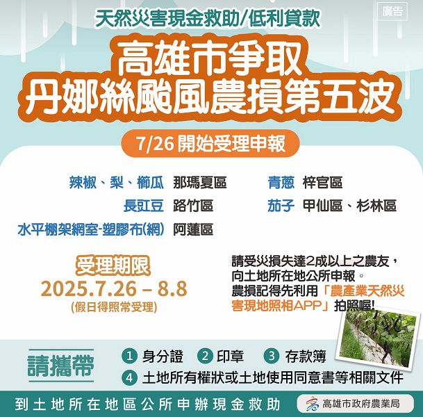 高雄地區受到丹娜絲颱風強大風雨影響,經公所通報,再次成功爭取那瑪夏區(辣椒、梨、櫛瓜)、路竹區(長豇豆)、甲仙、杉林區(茄子)、阿蓮區(水平棚架網室-塑膠布(網))及梓官區(青蔥)等7項納入農產業天然災害現金救助項目,農業部已正式公告自7月26日至8月8日止於土地所在地公所受理農民申報。