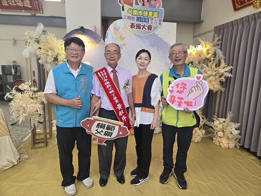 為慶祝88父親節,佳里區公所天在佳里區六里聯合活動中心舉辦「114年度模範父親、鑽石婚暨孝行獎表揚活動」,佳里區長林耿漢代表黃偉哲市長,向辛苦的父親們、結縭60年以上夫妻、孝行楷模獻上誠摯的祝福,並親自頒贈賀匾,藉由表揚活動宣揚父親對家庭及子女無怨無悔的付出與努力,並表達對父親的感謝、禮讚夫妻結縭60年以上、獎勵孝行楷模,鼓勵民眾見賢思齊。圖為陳昆和議員與警察局路老師李晟邦警官出席佳里區114年度模範父親、鑽石婚暨孝行獎表揚大會。(圖文:台南記者黃永豐)