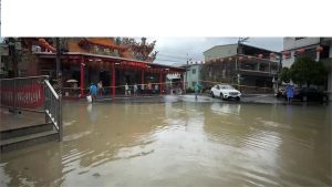 【記者陳良安南投報導】暴雨狂襲南投縣,南投市、中寮鄉時雨量高達88、71.5毫米,南投市多處淹水,綠美橋畔的駕訓班停車場淹成小河又有多輛汽車泡水,低窪區民眾無法出門;另中寮鄉也因急降雨,樟平溪暴漲,「泡麵土地公」石龍宮聯外道路淹水,水灌進石龍宮下方供奉王爺廟殿,廟方人員已警戒中。