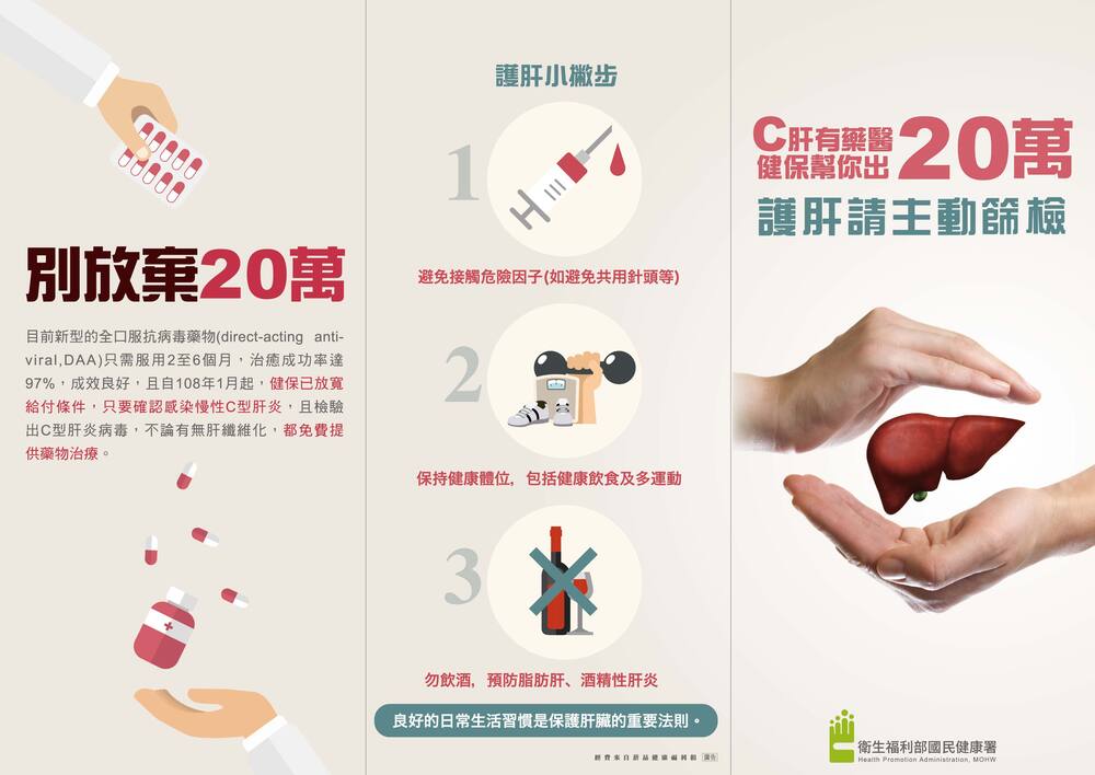 肝癌是國人癌症死因第2位,常由B、C型肝炎未治療導致肝硬化進而惡化,感染C型肝炎初期幾乎無症狀,等到出現異狀時多已是肝硬化甚至肝癌。113年桃園市因慢性肝病及肝硬化死亡人數約287人。為避免錯過黃金治療期,務必把握「主動篩檢、積極就醫、早期治療」三步驟。桃園市提供免費肝炎篩檢,民眾只需攜帶健保卡前往本市546家合約院所(https://gov.tw/dun)或查詢桃園市社區整合式篩檢服務之時間地點,選擇需要的篩檢服務場次接受檢查。若篩檢為C型肝炎陽性,健保給付治癒率高達98%的口服新藥DAA。此外,避免接觸危險因子也是重要的護肝小撇步,包括不與別人共用針具、刮鬍刀、牙刷、指甲剪,及不從事無保護的性行為等。