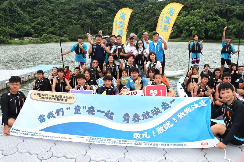 【記者林盈焜羅玉女苗栗報導】為落實推動《兒童權利公約》,苗栗縣政府與救國團攜手辦理國中青少年暑期「水感行動.夏日挑戰營」,31日上午於頭屋鄉明德水庫海棠島水域遊憩中心舉行划龍舟板競賽體驗活動,苗栗縣長鍾東錦更親自換上救生裝備、騎水上自行車下水與學員互動,鼓勵勇敢挑戰、團隊合作,創造難忘回憶。