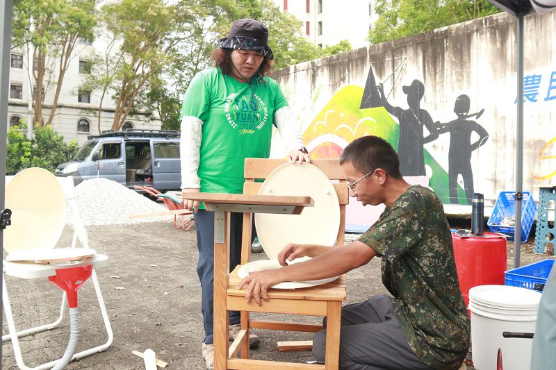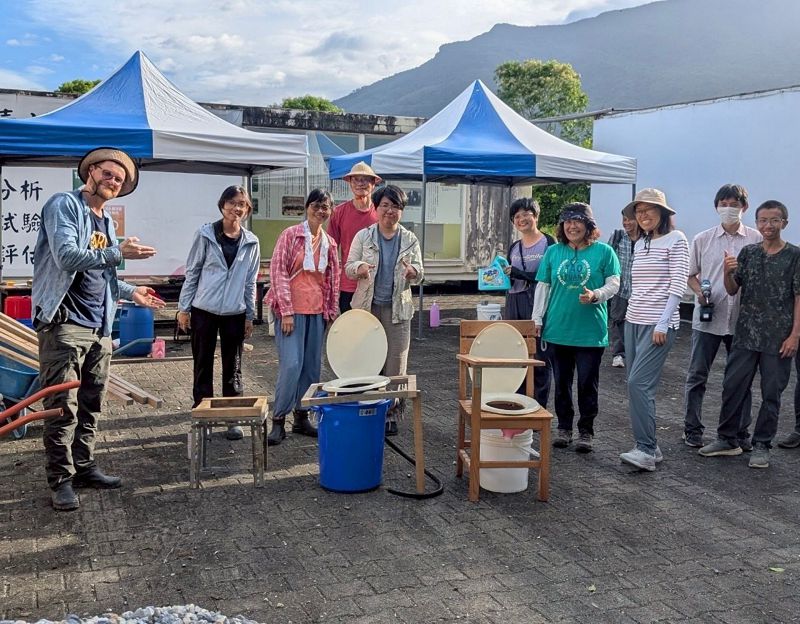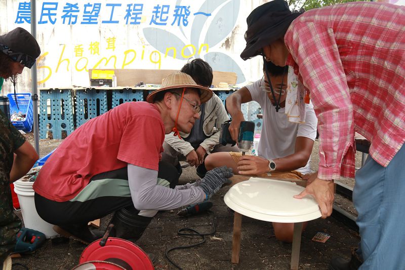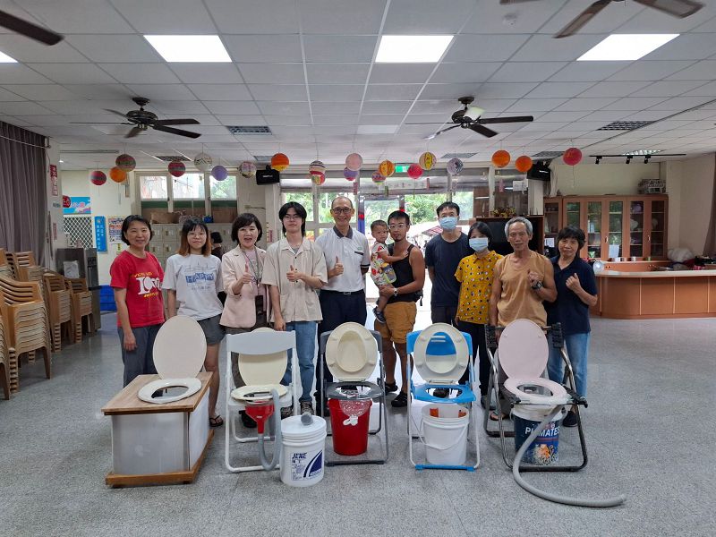 學員們發揮創意,將農場裡廢棄的空桶、課桌椅、角鋼及木材等循環再利用,自製環保又實用的行動式乾濕分離的乾式馬桶。運作方式是讓尿液進到排水管,而糞便排泄物另外置於有通風管的空桶,上完廁所後加入米糠、枯葉等,再把蓋子蓋好味道不會散出來,經過簡單的設計與發酵,最終還可作為果樹類植物的肥料。學員陳秀玉表示,因為自己也有務農,所以就地取材外,最後還可以變成肥料,覺得是一舉數得。