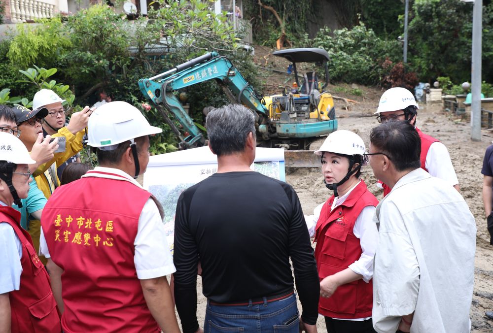 市長盧秀燕表示,受到近日豪雨影響,台中市單日雨量創13年新高,其中北屯大坑測站自7月28日至8月1日累積雨量近600毫米,造成土石流與道路中斷。有社區多戶受災,政府已出動機具清運,預計兩日內完成初步清理。