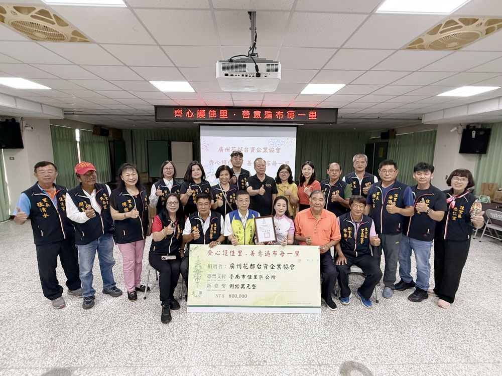 廣州花都台資企業協會捐贈儀式昨天上午在佳里區公所舉行,以「齊心護佳里.善意遍布每一里」為主題,象徵企業與地方共同守護家園的心意。佳里區長林耿漢表示,這次捐款平均分配轄內16里,每里5萬元,由各里依實際需求規劃清潔人力支援、工具購置及公共空間整理。