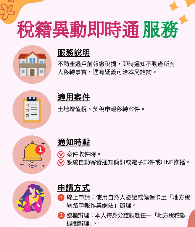 【記者張毅基隆報導】為強化不動產交易安全,防範詐騙案件發生,基市稅務局自今年7月1日起正式推出「稅籍異動即時通」服務。民眾只要完成申辦,未來名下房屋或土地移轉,申報契稅或土地增值稅時,系統即會透過電子郵件、手機簡訊或LINE推播等方式,即時通知,協助民眾第一時間掌握不動產異動資訊,保障財產安全。