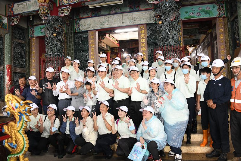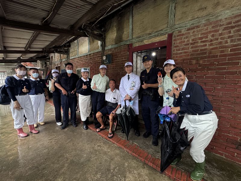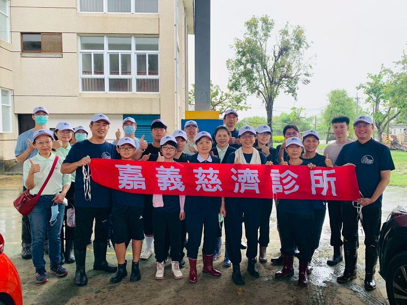 斗六慈濟醫院院長簡瑞騰、大林慈濟醫院副院長曾國枝帶領下,43位大林及斗六慈濟醫院的同仁、眷屬與志工,冒雨前往六腳鄉港尾寮代天府集合,準備參與慈濟志工的修繕工作。目前擔任衛福部醫福會副執行長的前大林慈濟醫院副院長林名男也特地南下加入行列。