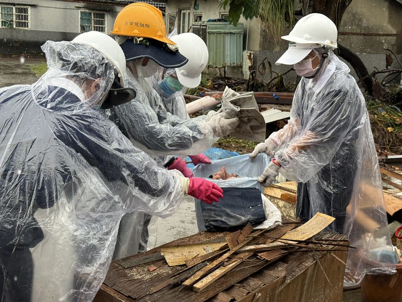 就這樣,在案主的辨識下,該留的、該捨棄的先行分類,志工再以人力接龍的方式,在泥濘中,一樣樣將泡水的床墊、衣櫃、天花板的木片等許多雜物,一件件清出放置庭院。