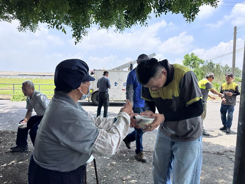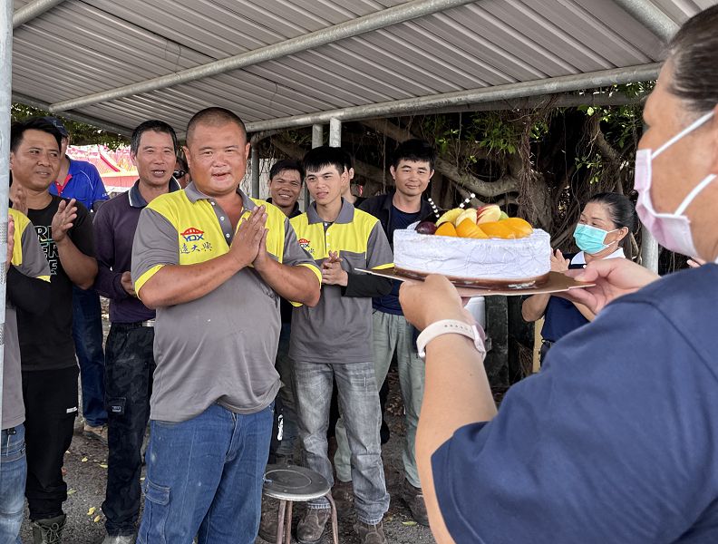 楊智欽表示,感恩志工安排,很感恩也很驚喜,剛才去巡工地,來到這裡看到有蛋糕、有水果、有熱湯、有甜點、有便當,分很多台車陸續載來。我們工班從義竹、從六腳一起來。共祝父親節快樂。大家修繕後一起吃便當聚餐很有意義,心裡也感到很踏實,在父親節付出是一件很有意義的事情,很感恩員工一起來共善。