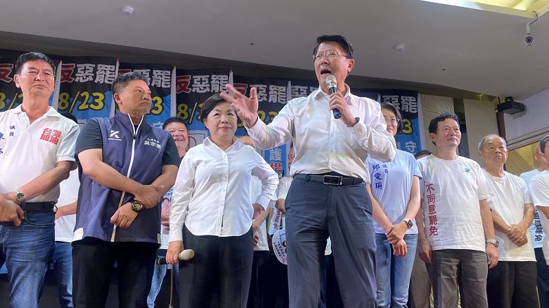 立法院副院長江啟臣登場大喊「后里加油!」讚楊是中台灣支柱,天天與她同搭清晨高鐵往返開會,關鍵法案與建設都親力親為,「這樣的立委,沒有理由被罷免!」呼籲823「再贏一次、贏更多」。他也提到去年川普當選,世界各國面臨關稅大談判大交易,執政黨卻在搞大罷免,而在野黨則反制罷免,長達半年時間國家內耗,全世界沒有這樣的民主國家。