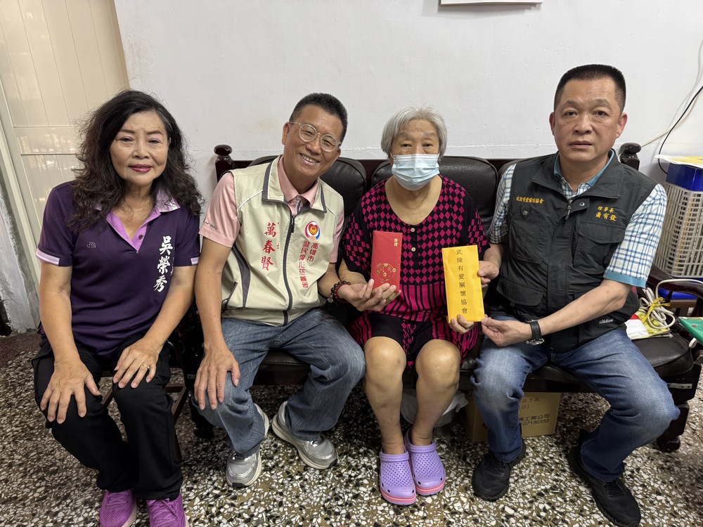 高雄市左營區屏山里一位年已8旬的李姓老婦人,原與女兒相依為命,但今年7月女兒不幸心肌梗塞過世,讓她頓失依靠,又因身體狀況欠佳無法工作,致使生活陷入困頓;經里長吳榮秀向警民愛心慈善會求助,理事長萬春賢得知確認後,隨即慷慨解囊拋磚引玉,獲得慈善會顧問黃文豐與多位會員,以及高雄慈濟靜思堂講師黃明朝、文府國中校長林啟文與家長會長謝秉濠、宏福中醫院長林威君、伍正明建設公司董事長林三孃等人熱烈響應;難能可貴的是,台中市武陵有愛關懷協會除捐贈5萬元外,理事長蕭有發還專程南下和萬春賢理事長一同前往慰問送暖,讓李姓老婦感激不已!萬春賢理事長表示,警民愛心慈善會幫助弱勢的正能量效應,已逐漸擴散至全台各地,行善沒有距離遠近及國界之分,期許愛心散發出的熱與光,能照亮各角落,充滿愛與溫馨!(圖文:記者于欽智)