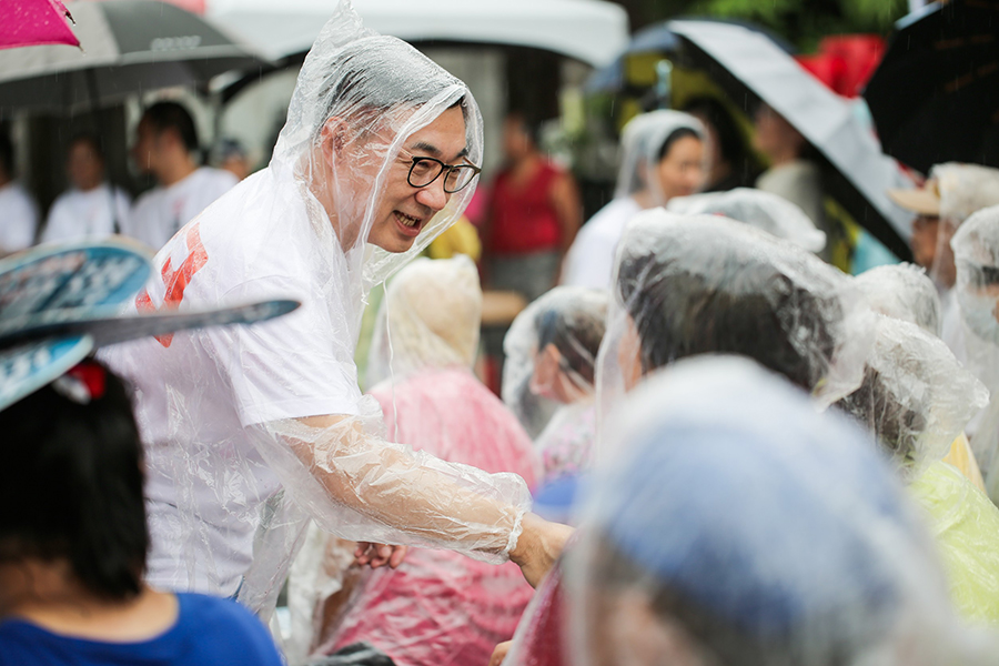 10日晚於石岡舉辦反罷免團結晚會,江啟臣穿雨衣在人群中握手感謝大家冒雨出來力挺。(記者彭勝郎攝)