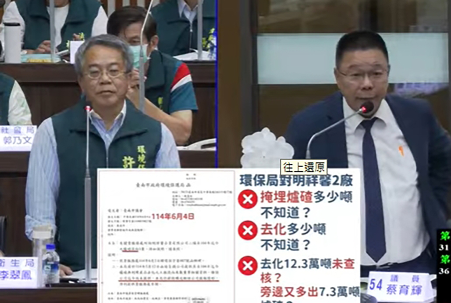 蔡育輝指出,環保局為處理這些爐碴,發公文要求學甲爐碴案場掩埋物,必須要在112年11月1日起2年內去化銷售完畢,也就是114年10月31日是截止日,目前已是8月,結果明祥鑫2廠下方的爐碴都沒有開挖?環保局說,明祥鑫不同意開挖,因為涉及私人土地,再者怕強行開挖導致工廠受損。