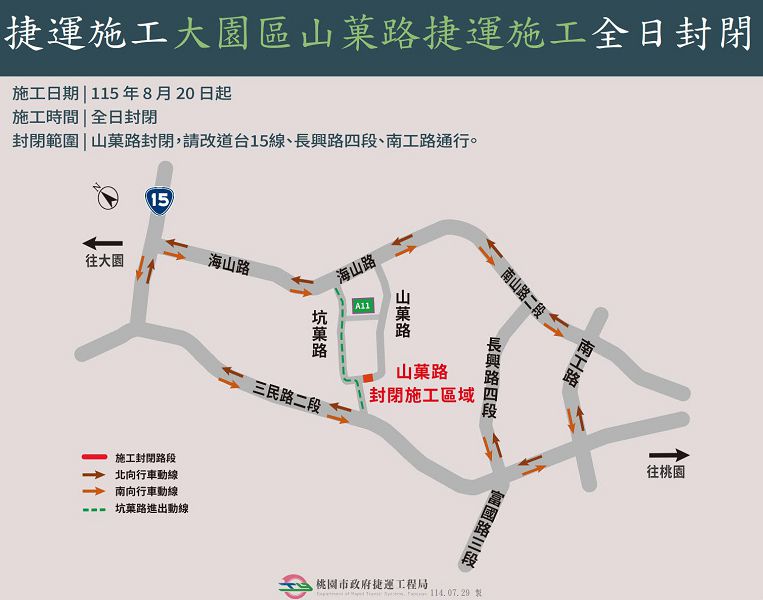 因配合桃園捷運綠線施工需要,桃園市政府捷運工程局訂114年8月20日起進行公路崁下橋鋼構吊裝,將全日封閉山菓路,行經本路段者請改道台15線、長興路四段、南工路通行。施工團隊將秉持最小施工範圍、最短施工期程目標、最低交通影響等,盡早完成工程施作。最新的交維資訊,請上桃園市政府捷運工程局官方網站(https://reurl.cc/QWkZ90)查詢。(圖文/記者潘瑞如)