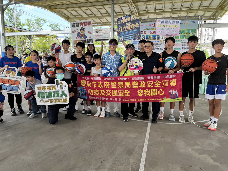 【記者黃永豐台南報導】國際扶輪3407D地區佳里扶輪社,為倡導青少年利用暑假期間走出戶外從事正當休閒活動,結合佳里分局及佳里區體育會,在佳里區體育公園光電籃球場舉辦「青春有愛,反毒反飆車」3對3籃球競賽暨鼓樂傳承聯合捐贈活動,以及關懷弱勢、兒少系列活動,來自佳里、西港、七股、山上、安南區、南區、南化等地區國小、國中、高中及大專院校等 115隊350多名青少年及青年朋友組隊參加,場面盛大,人聲鼎沸,氣氛嗨翻天。