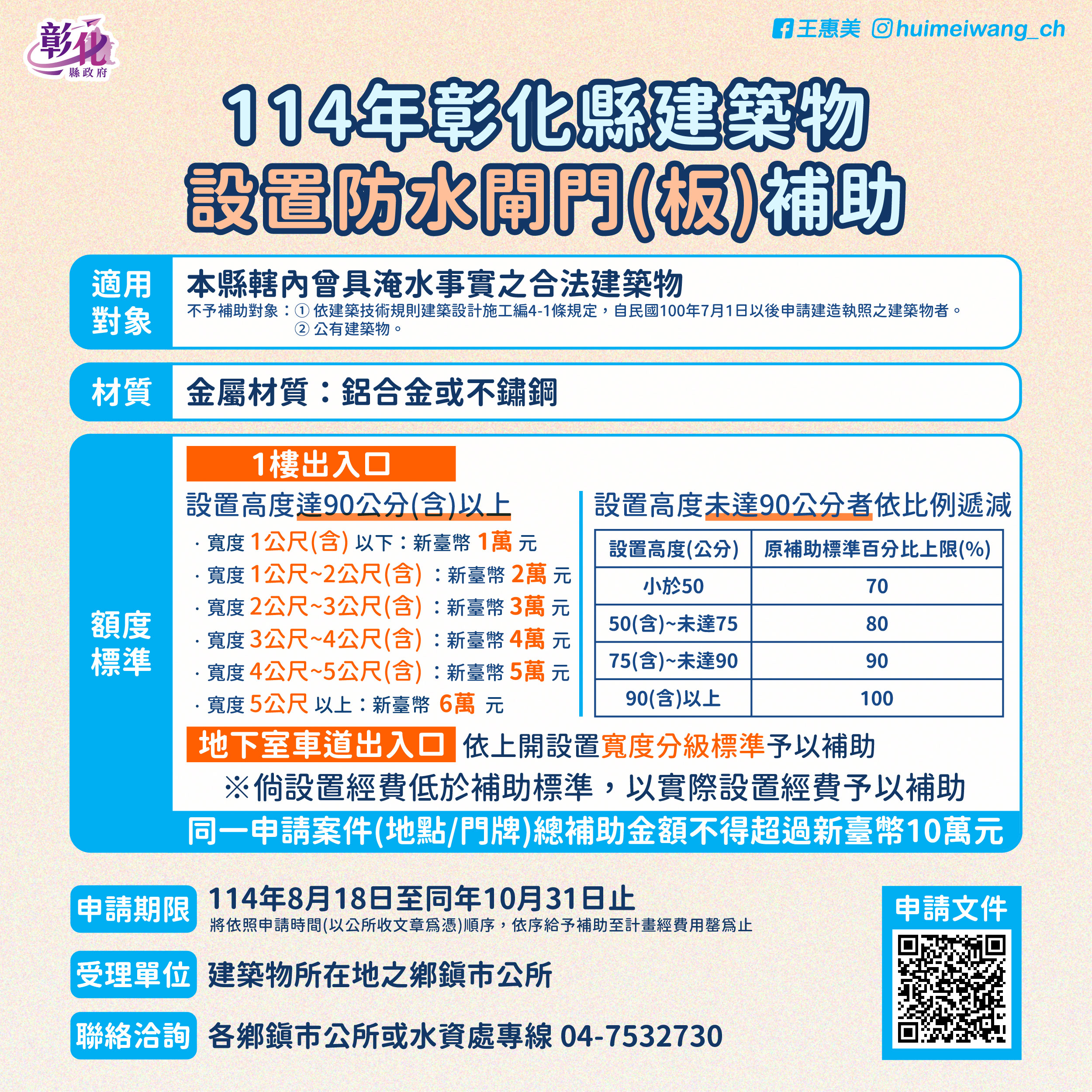 【記者鄭惠珠彰化報導】為強化本縣災害防護機制並減少民眾因暴雨積水導致建築物內財產損失,彰化縣政府訂定「114年度建築物設置防水閘門(板)補助計畫」,補助總經費達新臺幣1,000萬元,自114年8月18日至同年10月31日止開放受理,將依照申請時間(以公所收文章為憑)順序依序給予補助至計畫經費用罄為止,歡迎有需要的縣民向建築物所在地之鄉(鎮、市)公所申請。