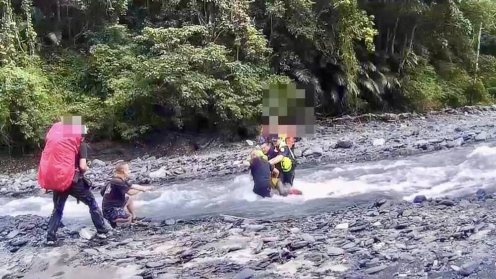 【記者陳良安南投報導】南投縣仁愛鄉武界林道栗栖壩,12日傍晚有登山民眾因溪水暴漲受困,武界派出所警員冒險度溪架設繩索,協助6名登山客涉溪,過程中1名女山友因體力不支,加上溪水湍急,雙腳一度懸空差點被沖走,幸好員警合力拉住她,讓她順利到對岸。